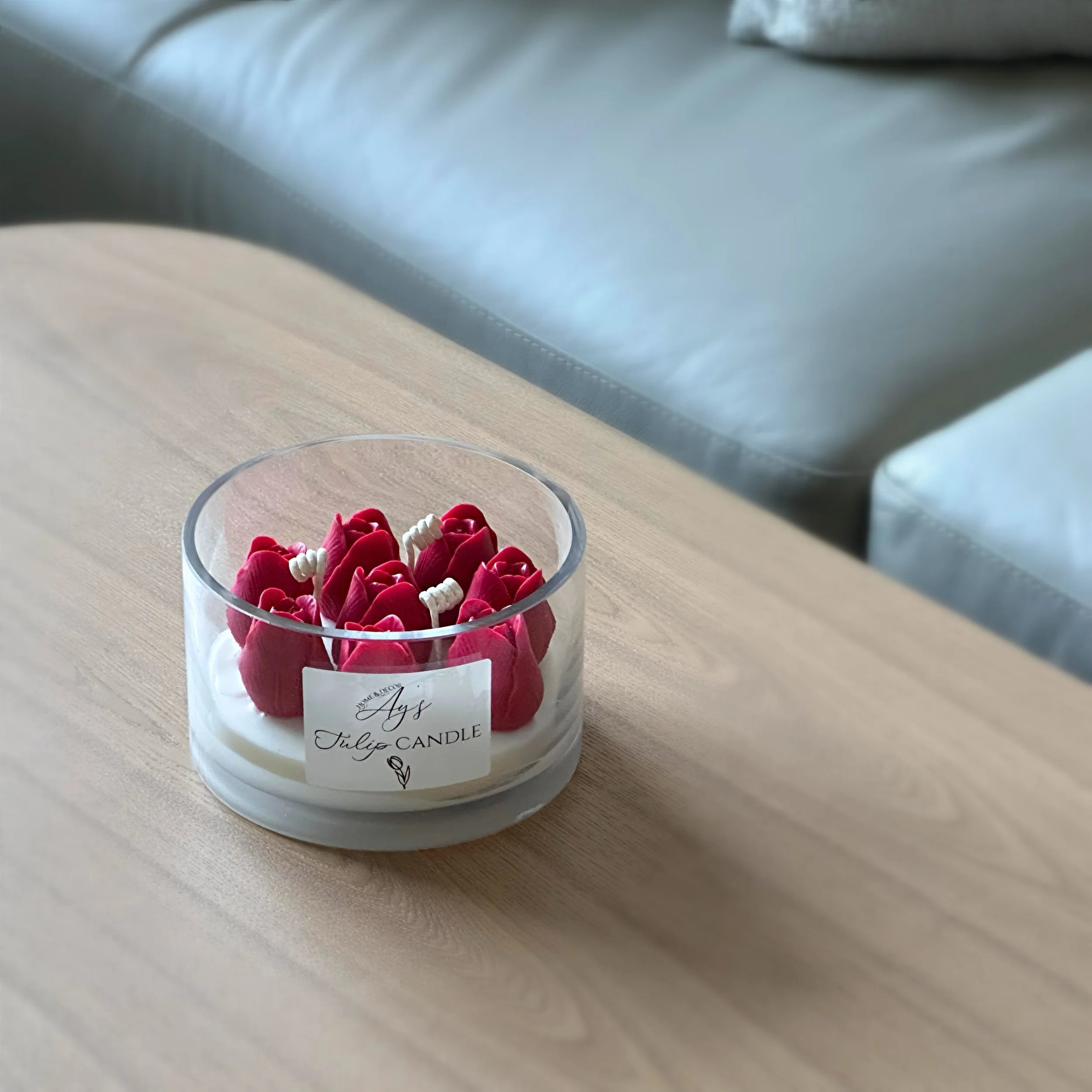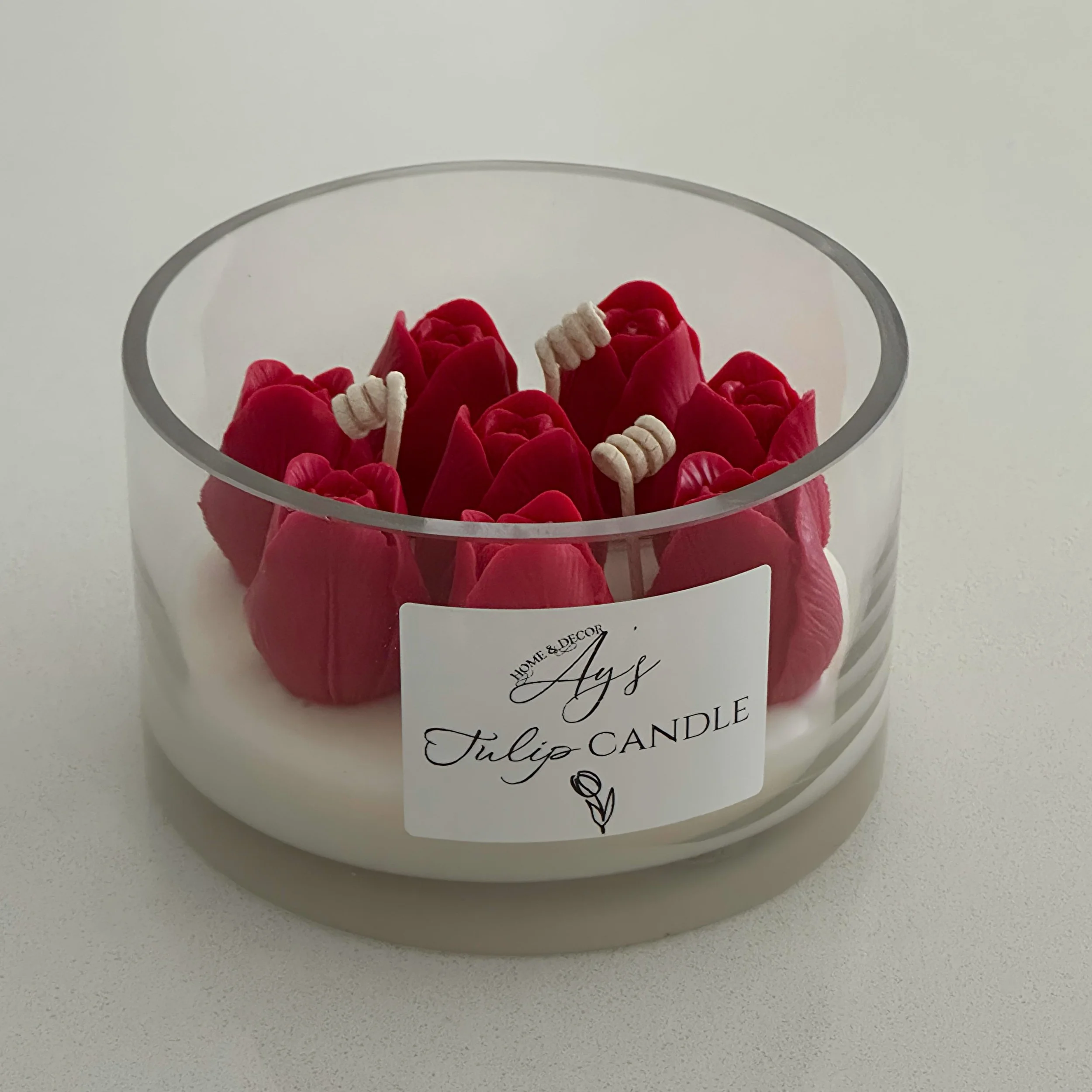 A tulip display crafted entirely from wax, set in clear glass — perfect for gifting or adding a beautiful touch to your home.